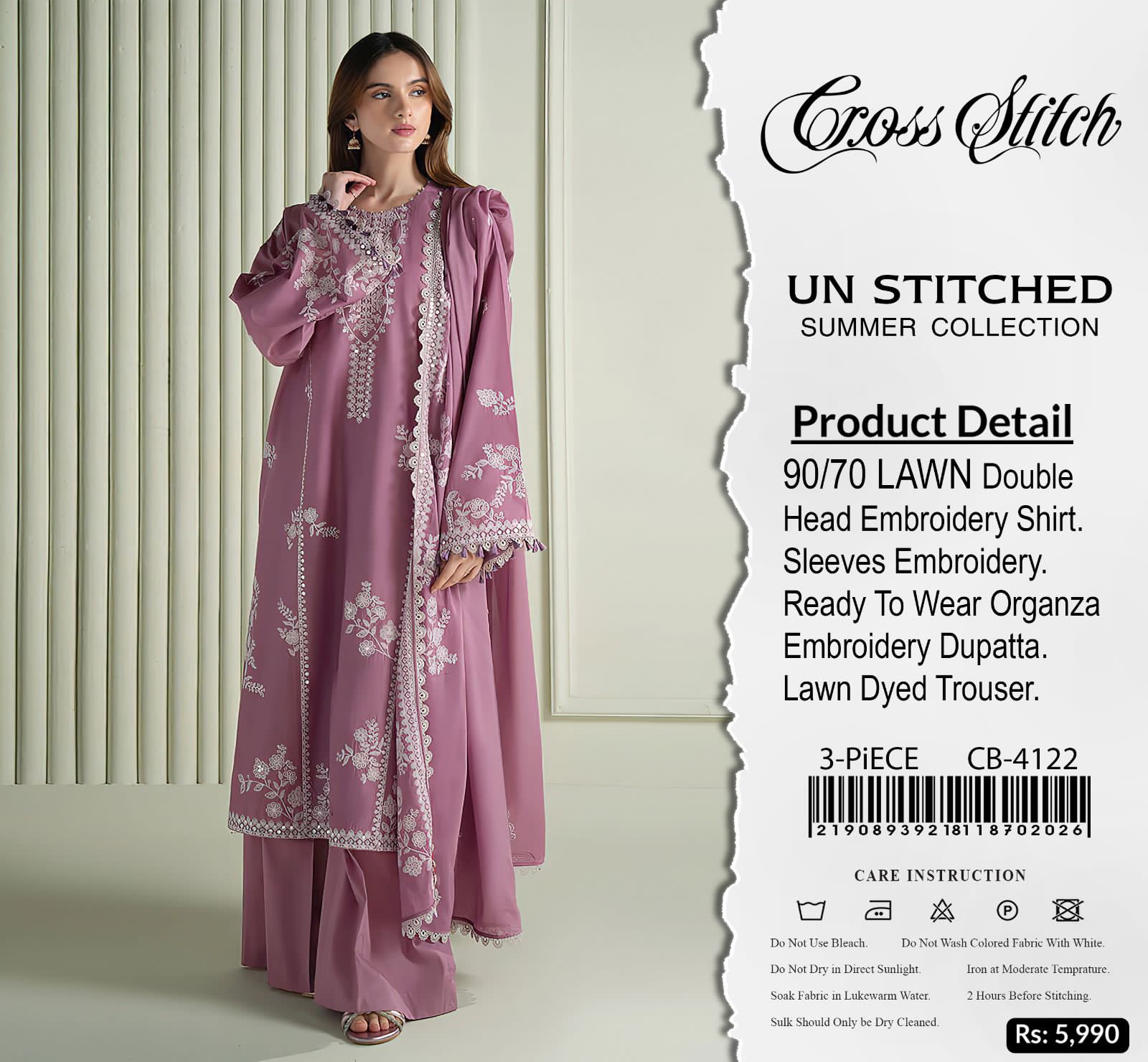 Upgrade your summer wardrobe with the Cross Stitch 4122 Luxury Embroidered Collection, crafted for women who love elegance, comfort, and premium quality. This stunning 3-piece suit is made from high-quality Airjet Lawn 90/70, designed to keep you cool and stylish all summer long.