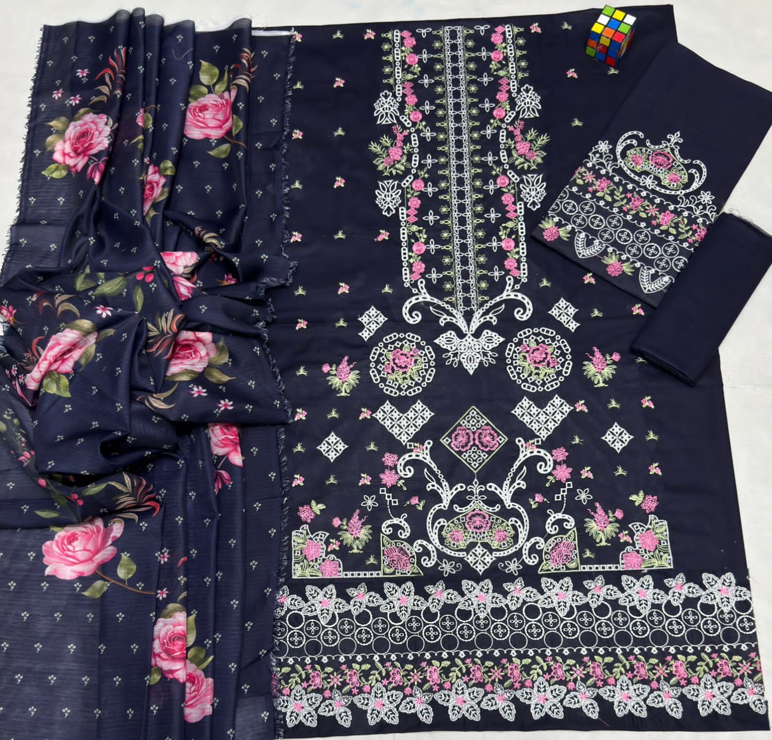 The suit features full heavy embroidery on the front, embroidered sleeves, daman patch, and a soft voil printed dupatta, creating a designer look without compromising on comfort. Ideal for Eid, summer parties, family gatherings, and casual formal wear.